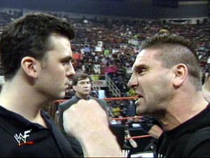 After Shane slaps Vince, or called the slap heard round the world, Ken Shamrock gets in Shane's face and told him that that was not right. Then Shamrock got fired from the corp. | ] ] ]coming soon heat,warzone, and Smackdown results, dont forget that Smackdown is on at 8:00 every Thurs. on UPN